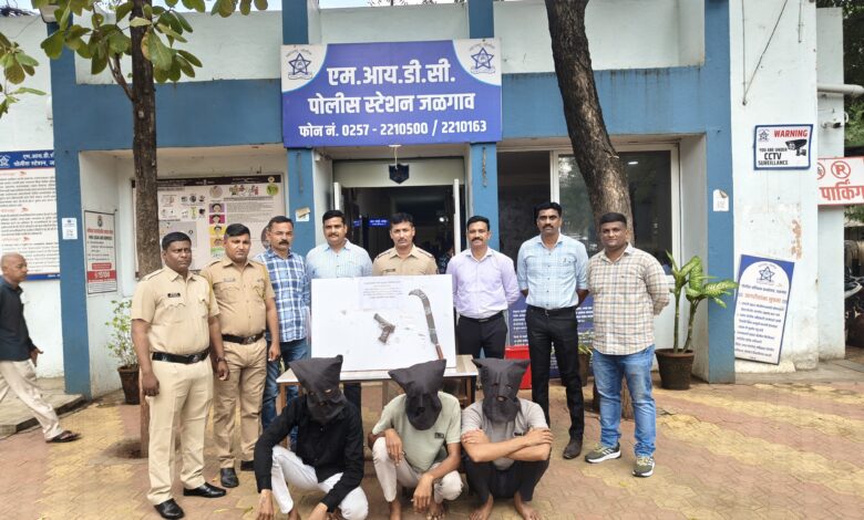 जळगाव जिल्ह्यातुन हद्दपार केलेल्या सराईत गुन्हेगारास दोन सार्थीदारांसह गावठी कट्टा, जिवंत काडतुस व धारदार कोयतासह एमाआयडीसी पोलीस स्टेशनच्या गुन्हे शोध पथकाच्या ताब्यात