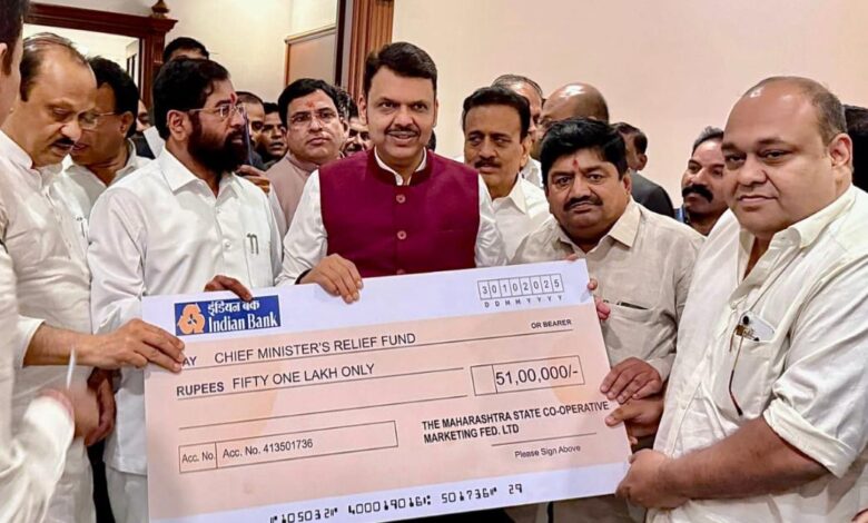 जळगाव, दि. 31 ऑक्टोबर 2025 : राज्यातील अतिवृष्टीग्रस्त शेतकऱ्यांच्या मदतीसाठी सामाजिक बांधिलकी जपत दि महाराष्ट्र स्टेट को-ऑपरेटिव्ह मार्केटिंग फेडरेशन लिमिटेड, महाराष्ट्र राज्य, मुंबई यांच्या वतीने मुख्यमंत्री सहाय्यता निधीमध्ये तब्बल ₹51,00,000 (एकावन्न लाख रुपये) इतक्या देणगीचा धनादेश मुख्यमंत्री देवेंद्र फडणवीस यांना मुंबई येथे सुपूर्त करण्यात आला.