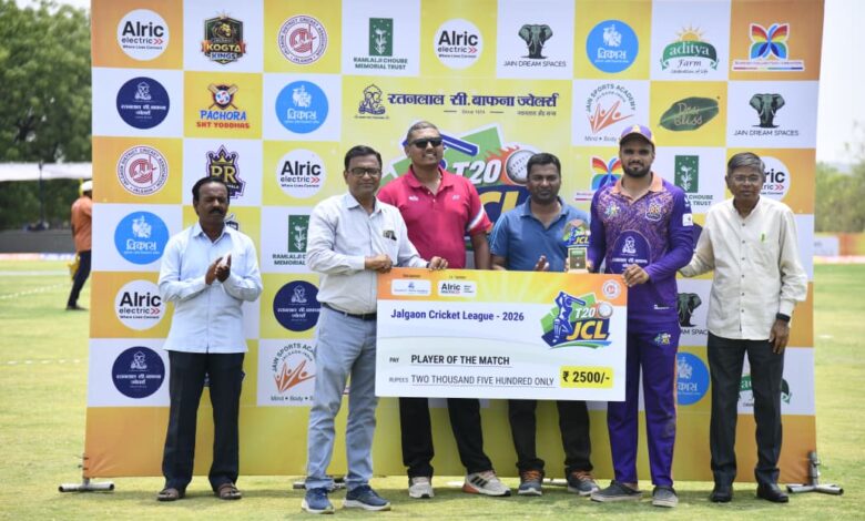 जळगाव दि.22 (धर्मेंद्र राजपूत): जळगाव जिल्हा क्रिकेट असोसिएशनच्या वतीने आयोजित रतनलाल सी. बाफना ज्वेलर्स प्रायोजित व अलरीक इलेक्ट्रीकल्स सहप्रायोजकत्वाखाली जळगाव क्रिकेट लिग लिग-२०२६, JCL T-20 मध्ये उपांत्यफेरीत पोहचण्याठी चुरस निर्माण झाली आहे. बुधवारी सकाळी रावेर रॉयल्स आणि पाचोरा एसकेटी योद्धाज यांच्यात झालेल्या अटीतटीच्या सामन्यात रावेरचा संघ विजयी झाला. दुसऱ्या सामन्यात अमळनेर सुहांस जायंट्स संघाने दणदणीत विजय मिळवला. तत्पूर्वी २१ रोजी झालेल्या तिसऱ्या सामन्यात चाळीसगाव एसपीसीसी चॅलेंजरने विजय मिळवला.